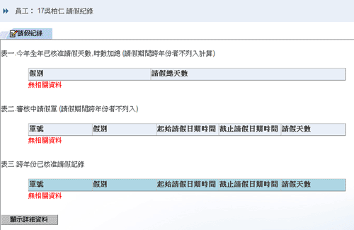 1. 當填表人按下〔查詢請假總數〕的按鈕時,則系統將根據填表人所填的請假人,而列出該請假人的: